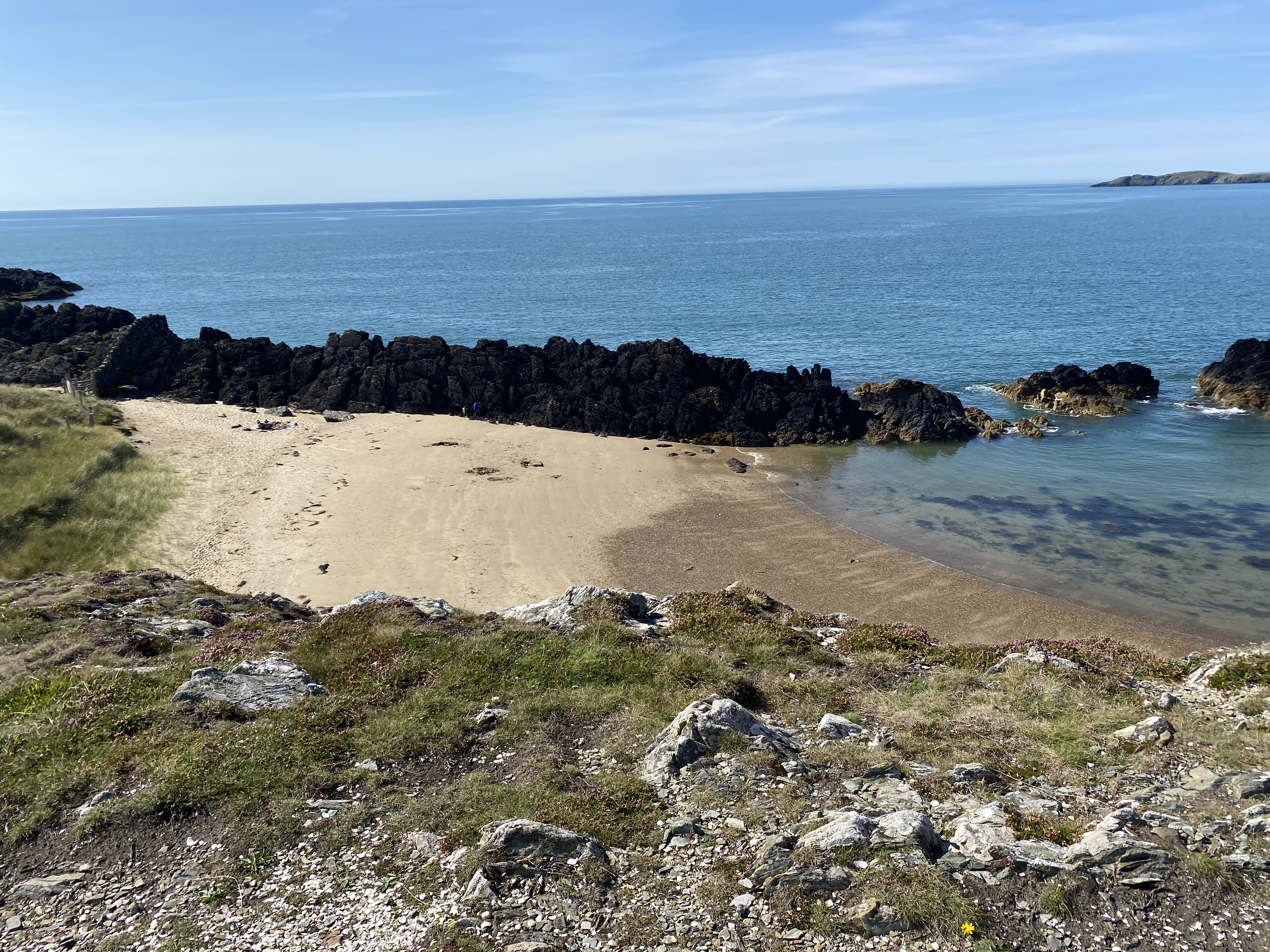 The bay itself has beautiful views out over the Snowdon mountain range, Caernarfon Bay and across the Lleyn Peninsula. Visit on a warm day and you would think you were in the Mediterranean. With the tide on the way out, the water was crystal clear which was great for finding and studying a variety of shells, particularly scallops and made the next part of the journey (we hadn’t planned) possible.